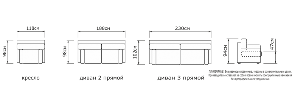 декоративных подушки размером 44х44см. Для кресла такие подушки следует заказывать отдельно. Все подушки модели, независимо от наполнителя, имеют съемные чехлы.